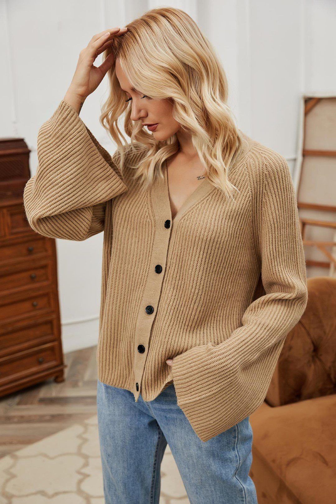 Fashion Buckle V-Neck Flared Sleeve Knit Top$12.19 USD
