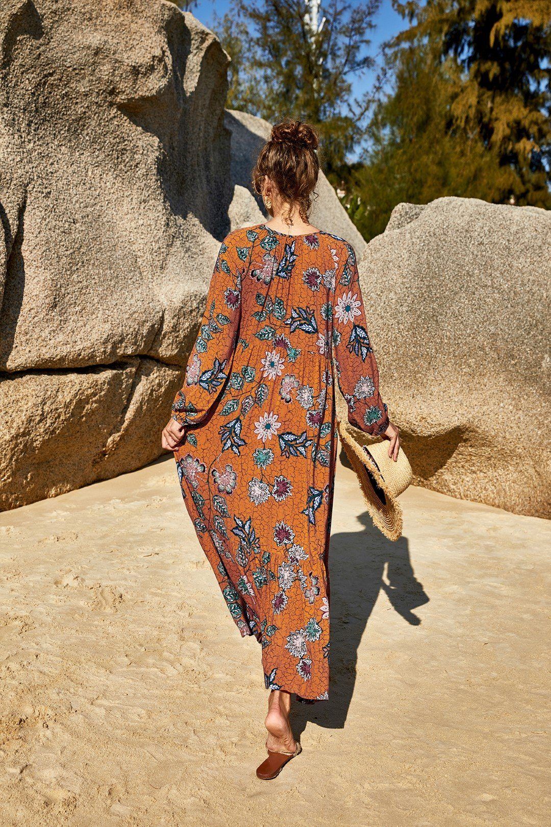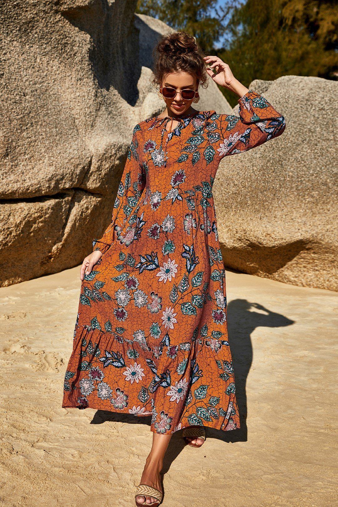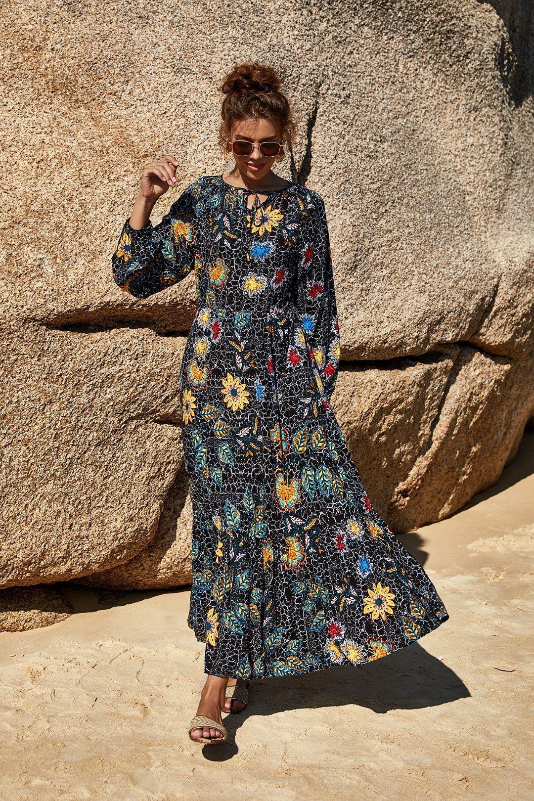 Exotic Floral Print Drawstring Maxi Dress