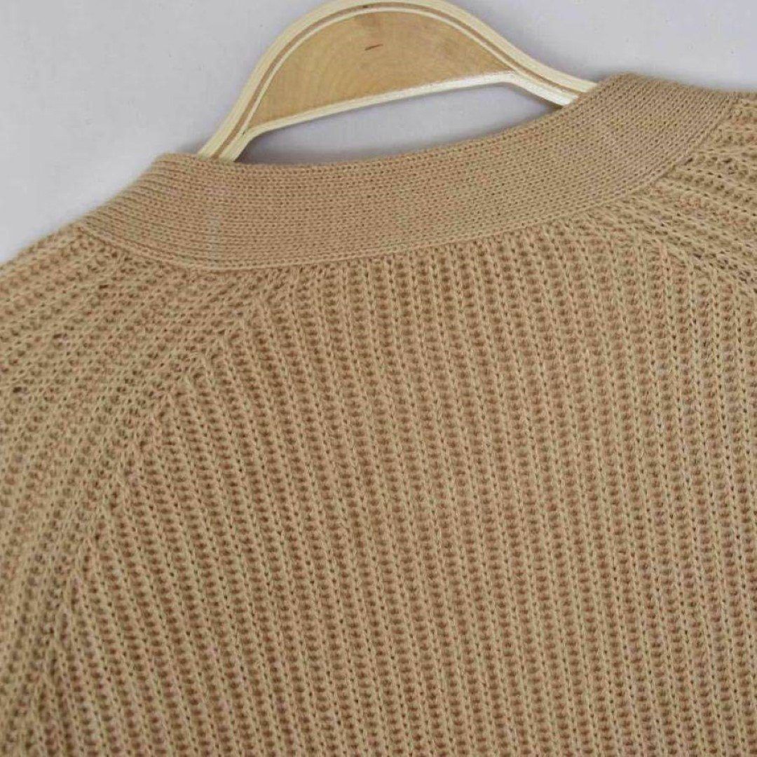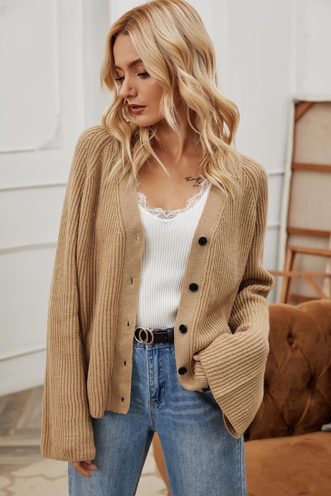 Fashion Buckle V-Neck Flared Sleeve Knit Top